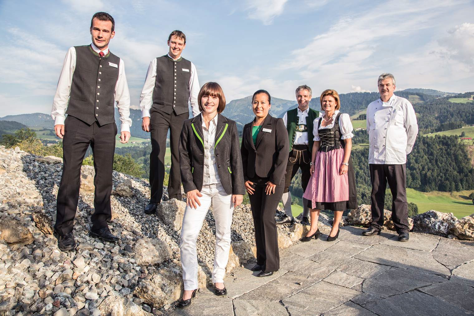 Bildbeschreibung: Die Abteilungsleiter im Bergkristall – Natur und Spa in Oberstaufen, von links: Markus Schlippe (Rezeptionsleitung), Tobias Reuthbuch (Serviceleitung), Stephanie Schneider (Spa Leitung), Janet Ordonez de Polo (Hausdame), Hans-Jörg und Sabine Lingg (Inhaber), Harald Weidinger (Küchenchef). Foto: Bergkristall - Natur und Spa Redaktionelle Verwendung erlaubt, Abdruck honorarfrei, Beleg an: Jensen media, Hemmerlestraße 4, 87700 Memmingen, Telefon 08331/991880, info@jensen-media.de |