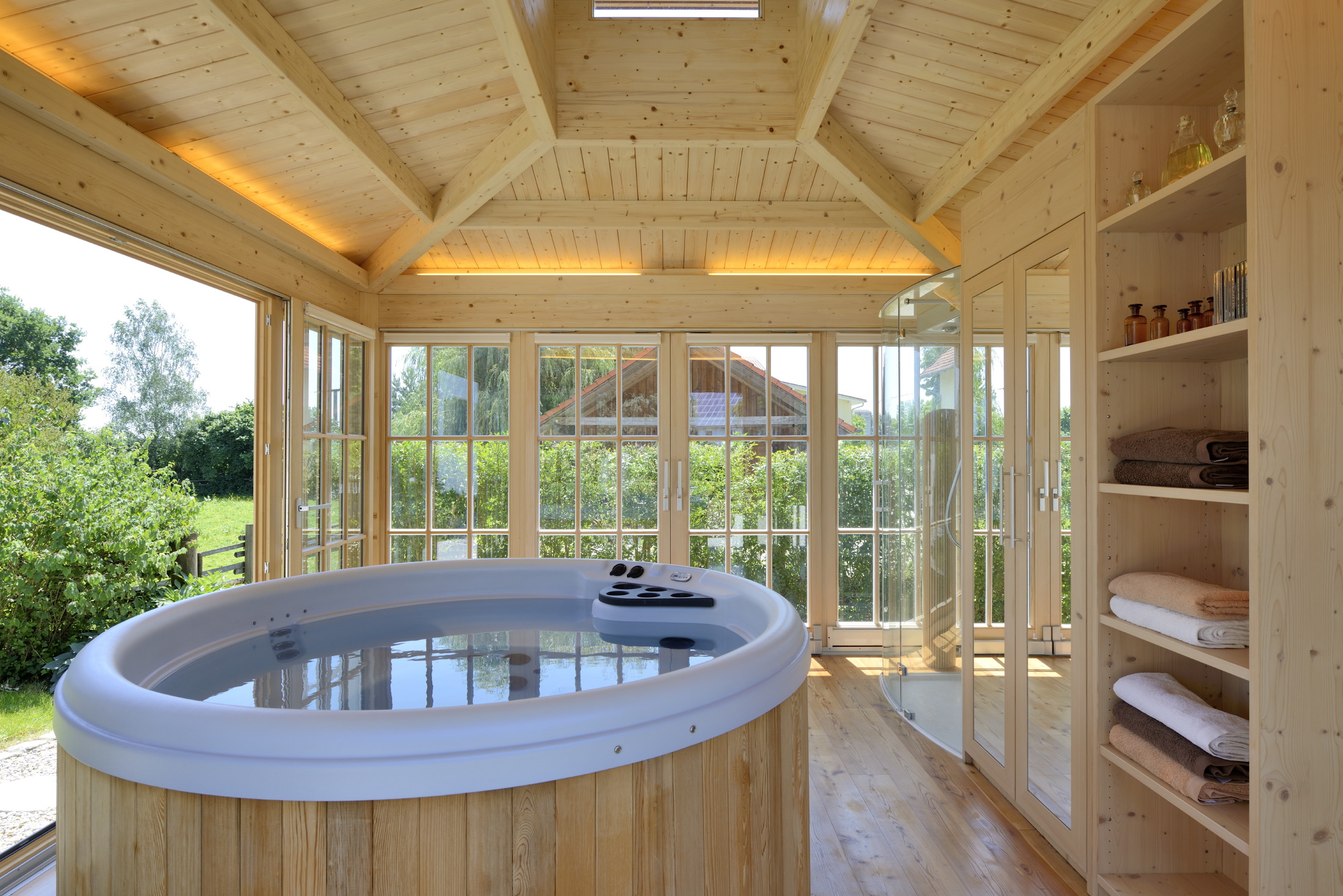 | Bildbeschreibung: Wohlfühlen im Whirlpoolhaus von Blockhausbau Hummel. Foto: Blockhausbau Hummel Abdruck honorarfrei, Beleg an: Jensen media GmbH, Hemmerlestraße 4, 87700 Memmingen, info@jensen-media.de, Telefon 08331/991880 |