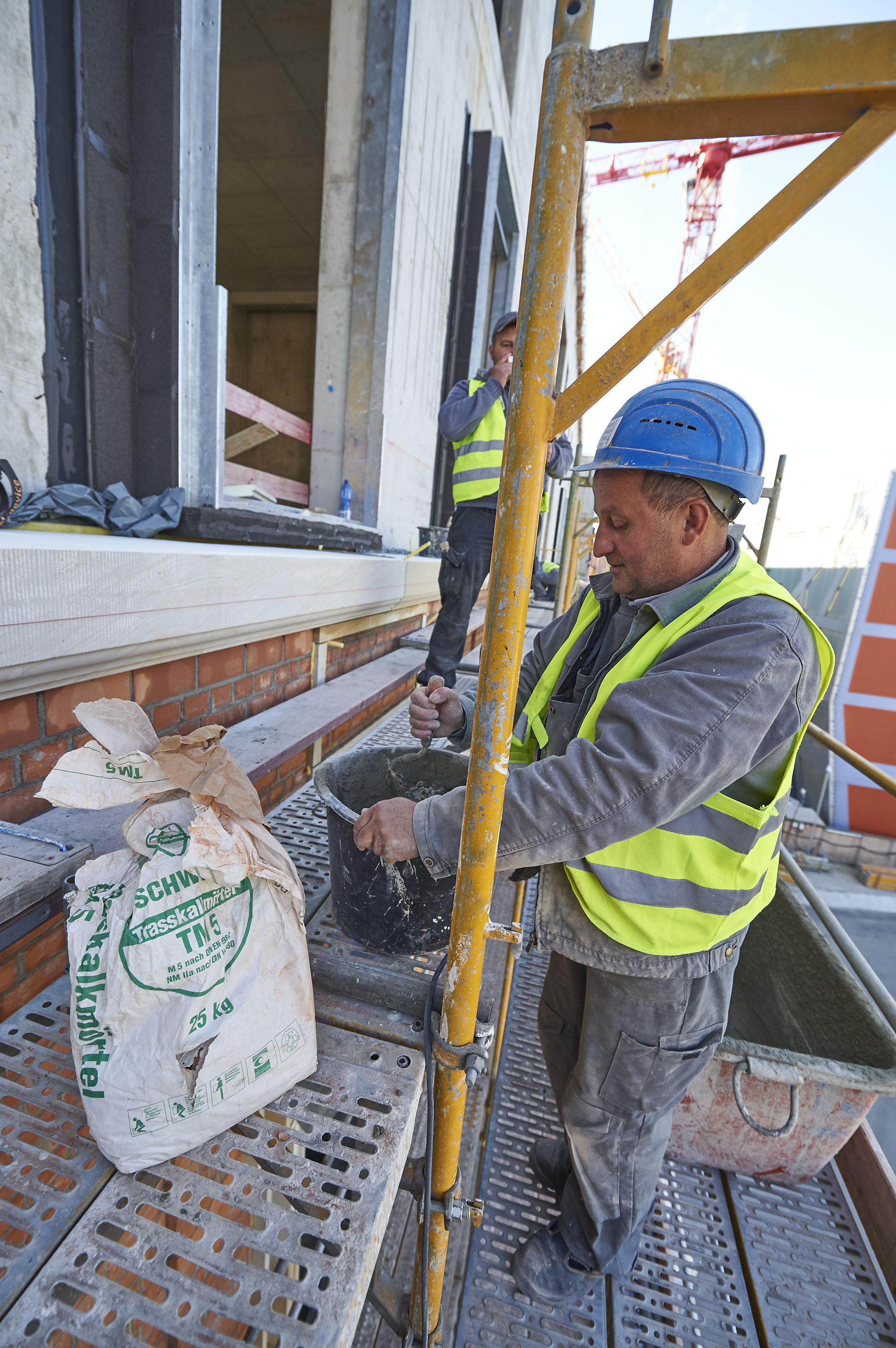 | Bildbeschreibung: Der Trasskalkmörtel TM 5 HS der Schwenk Putztechnik lässt sich von den Mitarbeitern der Bamberger Natursteinwerk Hermann Graser GmbH besonders effizient verarbeiten und verhindert ein Ausblühen der Ziegelsteine. Foto: Stephan Falk/Schwenk Putztechnik Redaktionelle Verwendung erlaubt, Abdruck honorarfrei, Beleg an: Jensen media, Hemmerlestraße 4, 87700 Memmingen, Telefon 08331/991880, info@jensen-media.de | |