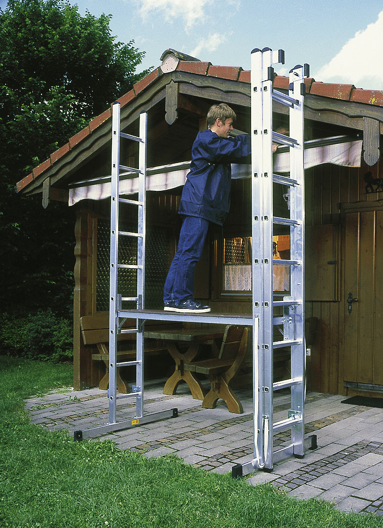 | Bildbeschreibung: Praktisch: Die Mehrzweckleiter kann mit einem Zubehörsatz zur Arbeitsdiele umfunktioniert werden. Foto: Günzburger Steigtechnik Abdruck honorarfrei, Beleg an: Jensen media, Hemmerlestraße 4, 87700 Memmingen, Telefon +49 (0)8331 991880, info@jensen-media.de |