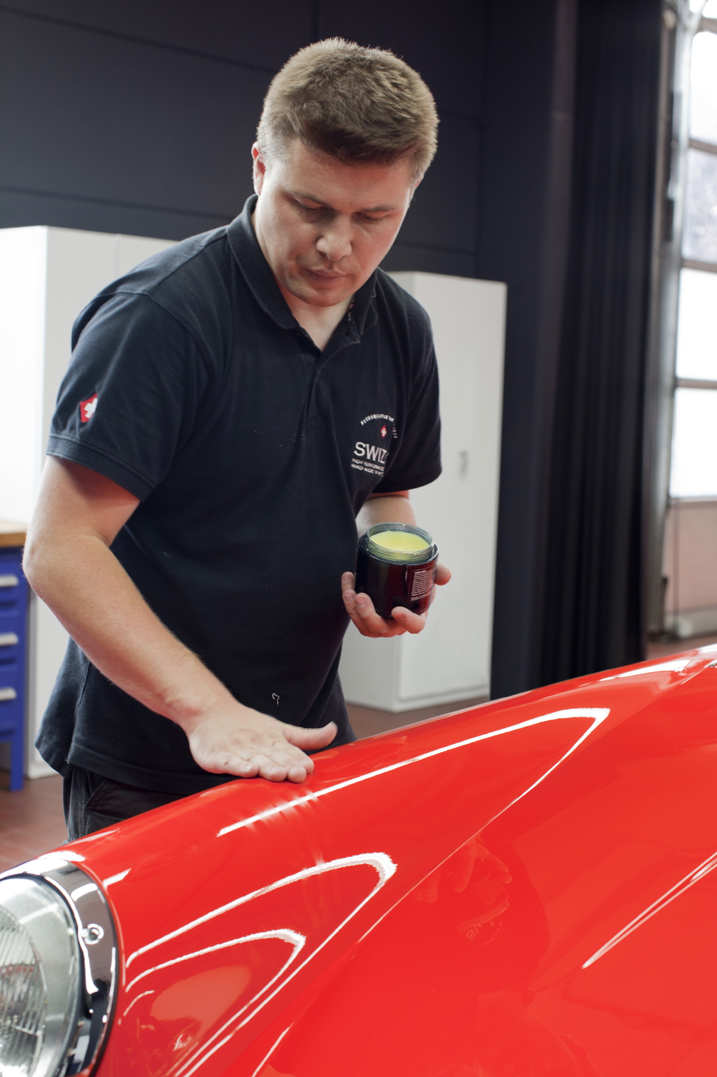 | Bildbeschreibung: Swizöl Handarbeit: Detailing-Experte Steffen Mielke von Swizöl beim Wachsauftrag Foto: Swizöl Redaktionelle Verwendung erlaubt, Abdruck honorarfrei, Beleg an: Jensen media, Hemmerlestraße 4, 87700 Memmingen, Telefon 08331/991880, info@jensen-media.de |