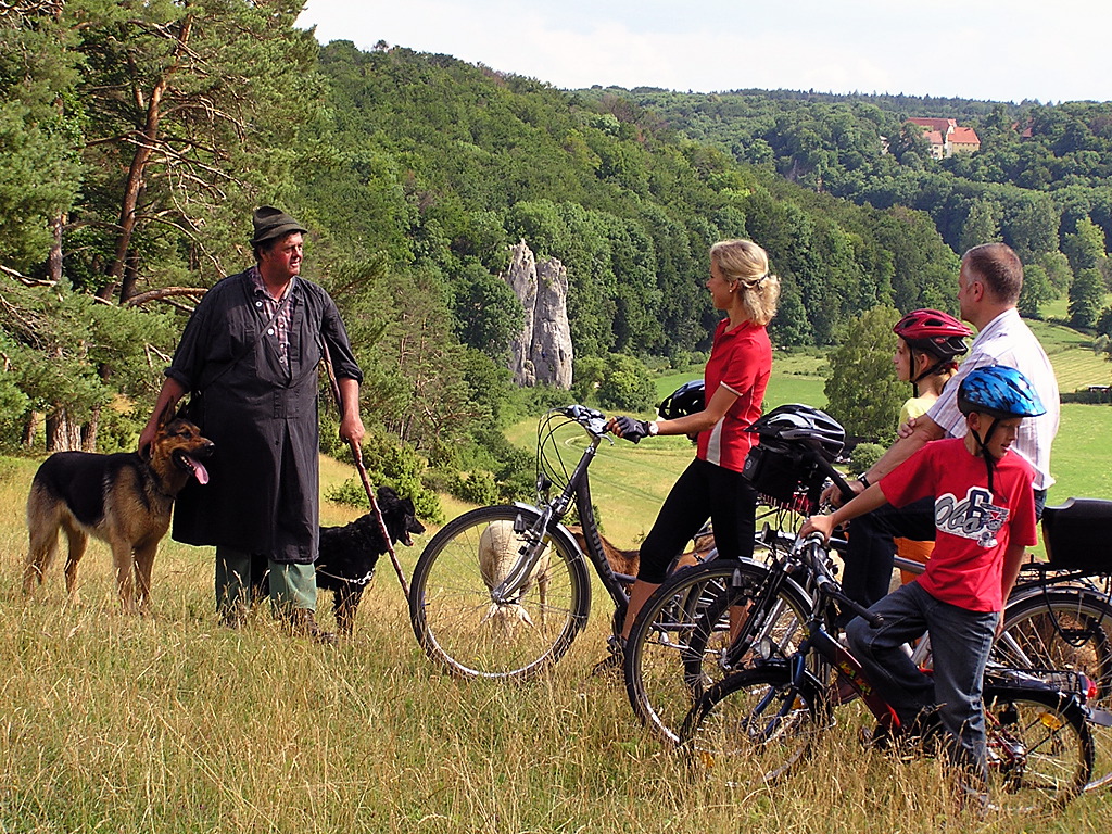 | Bildbeschreibung: Viersterne-Radweg Albtäler Radtour über den GeoPark Schwäbische Alb: Radler trifft Schäfer. Foto: Landratsamt Heidenheim Redaktionelle Verwendung erlaubt, Abdruck honorarfrei, Beleg an: Jensen media, Hemmerlestraße 4, 87700 Memmingen, Telefon 08331/991880, info@jensen-media.de |