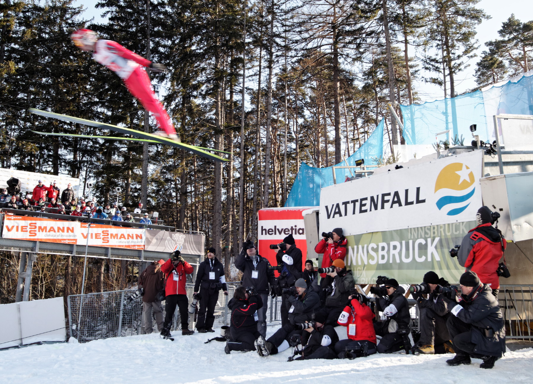 | Bildbeschreibung: Skispringer im Fokus der Fotografen in Innsbruck Foto: Neil Cook, OK Vierschanzentournee, Redaktionelle Verwendung erlaubt, Abdruck honorarfrei, Beleg an: Pressestelle Vierschanzentournee, Hemmerlestraße 4, 87700 Memmingen, Germany, Telefon 08331/9918850, presse@vierschanzentournee.com |
