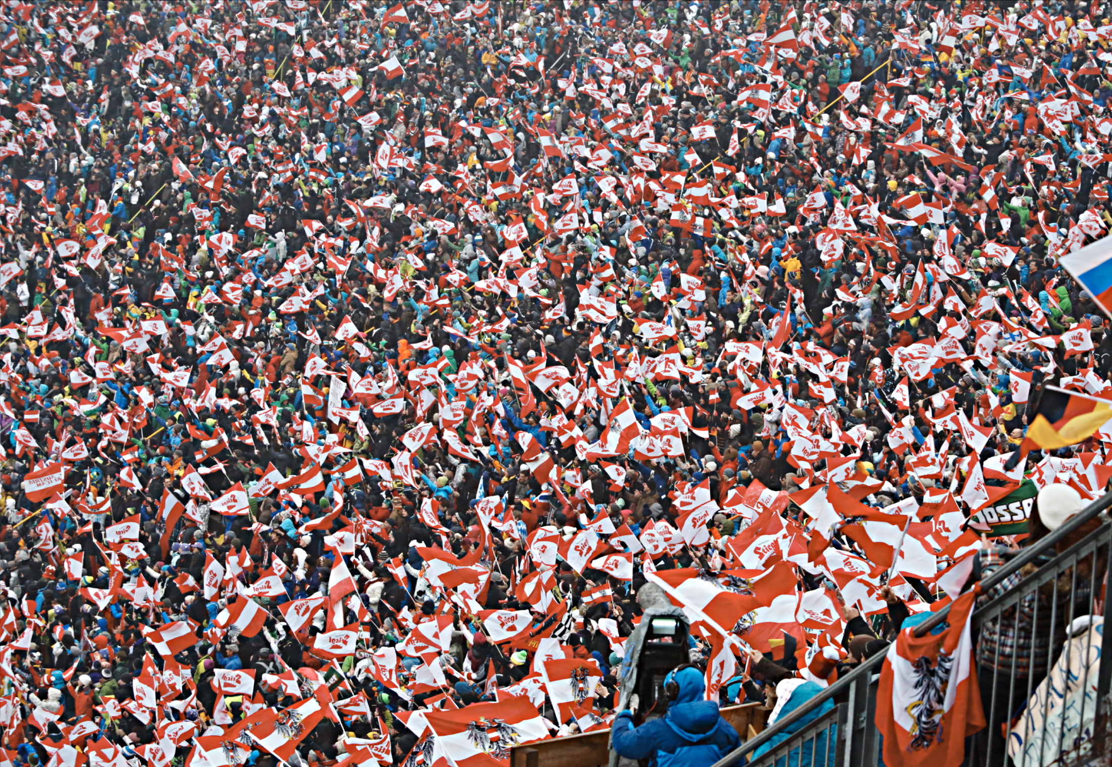 | Bildbeschreibung: Fans in Innsbruck Foto: Brigitte Waltl-Jensen, OK Vierschanzentournee, Redaktionelle Verwendung erlaubt, Abdruck honorarfrei, Beleg an: Pressestelle Vierschanzentournee, Hemmerlestraße 4, 87700 Memmingen, Germany, Telefon 08331/9918850, presse@vierschanzentournee.com |