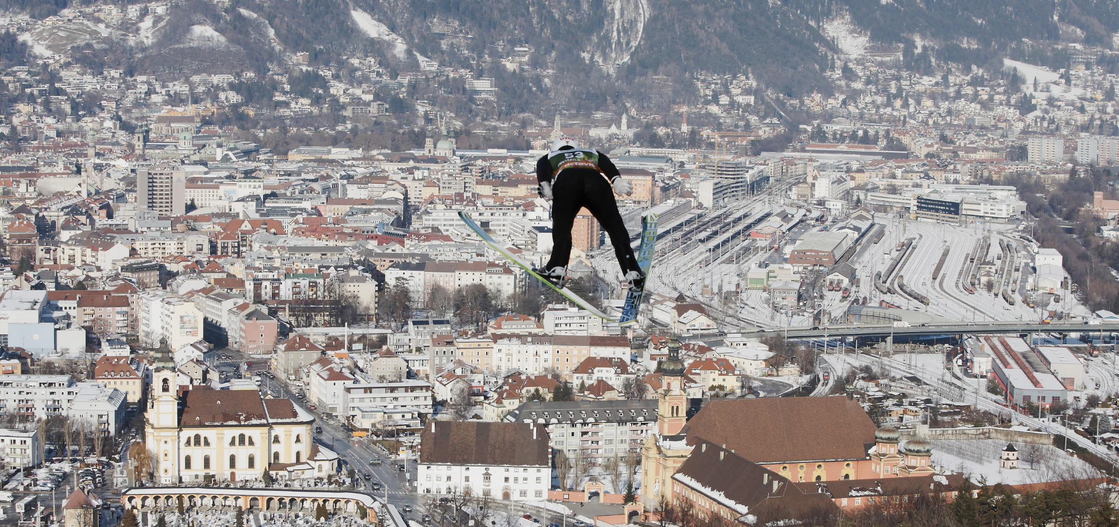 | Bildbeschreibung: Skispringer in Innsbruck Foto: Brigitte Waltl-Jensen, OK Vierschanzentournee, Redaktionelle Verwendung erlaubt, Abdruck honorarfrei, Beleg an: Pressestelle Vierschanzentournee, Hemmerlestraße 4, 87700 Memmingen, Germany, Telefon 08331/9918850, presse@vierschanzentournee.com |