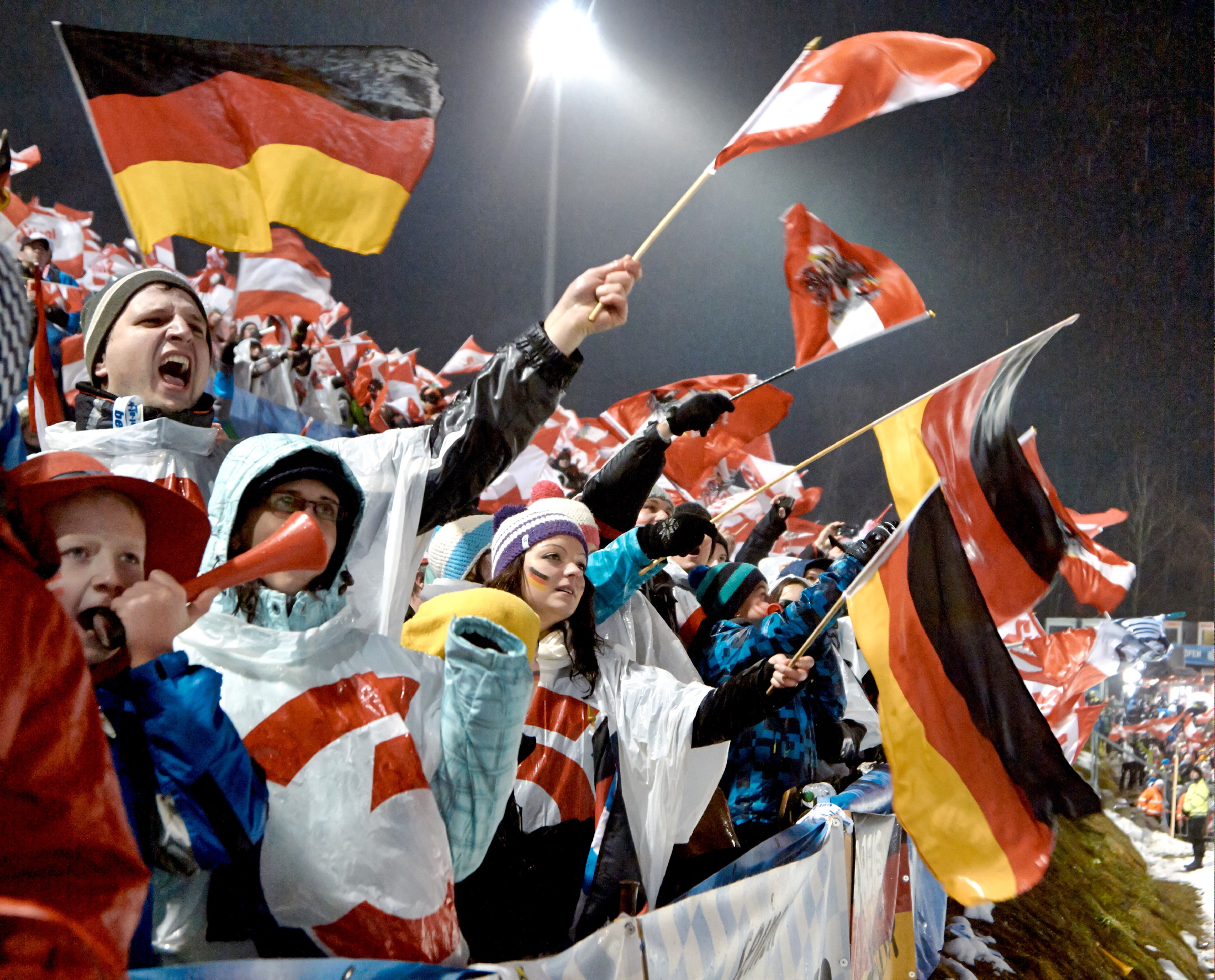 | Bildbeschreibung: Fans in Bischofshofen Foto: Neil Cook, OK Vierschanzentournee, Redaktionelle Verwendung erlaubt, Abdruck honorarfrei, Beleg an: Pressestelle Vierschanzentournee, Hemmerlestraße 4, 87700 Memmingen, Germany, Telefon 08331/9918850, presse@vierschanzentournee.com |