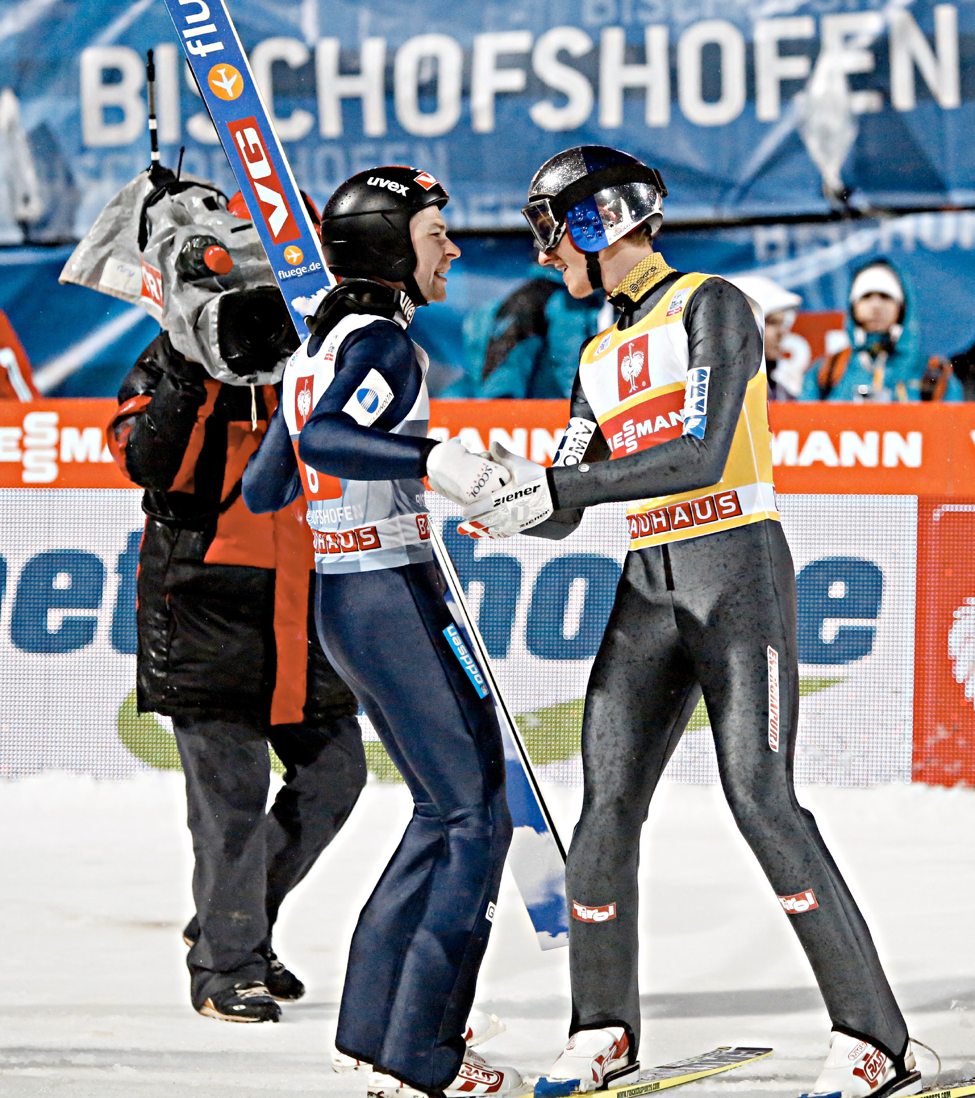 | Bildbeschreibung: Anders Jacobsen gratuliert Gregor Schlierenzauer, rechts, zum Tourneesieg Foto: Brigitte Waltl-Jensen, OK Vierschanzentournee, Redaktionelle Verwendung erlaubt, Abdruck honorarfrei, Beleg an: Pressestelle Vierschanzentournee, Hemmerlestraße 4, 87700 Memmingen, Germany, Telefon 08331/9918850, presse@vierschanzentournee.com |