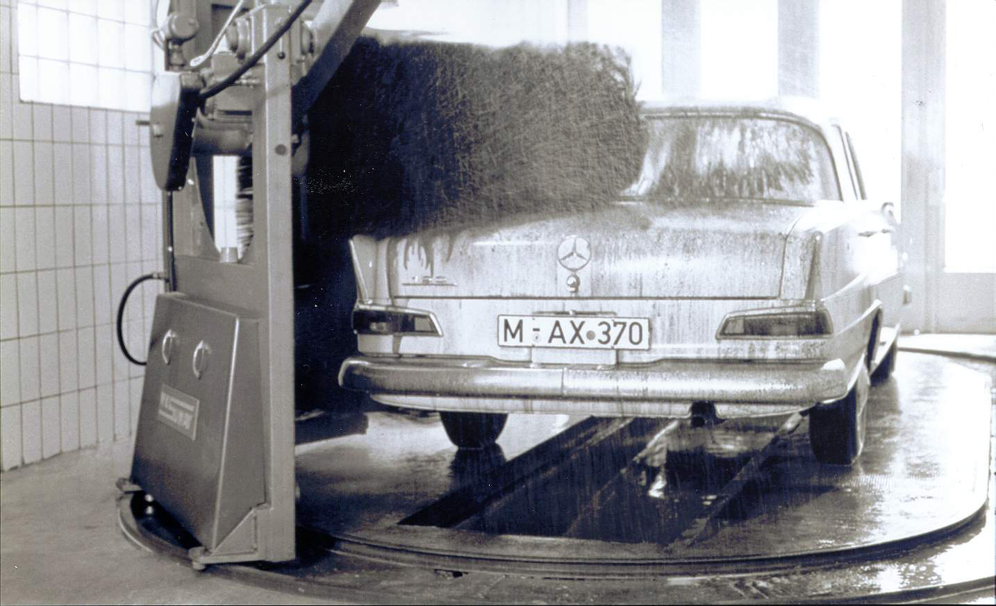 So begann alles: Die erste vollautomatische Autowaschanlage von WESUMAT kreiste noch um das Fahrzeug herum. Foto: WashTec